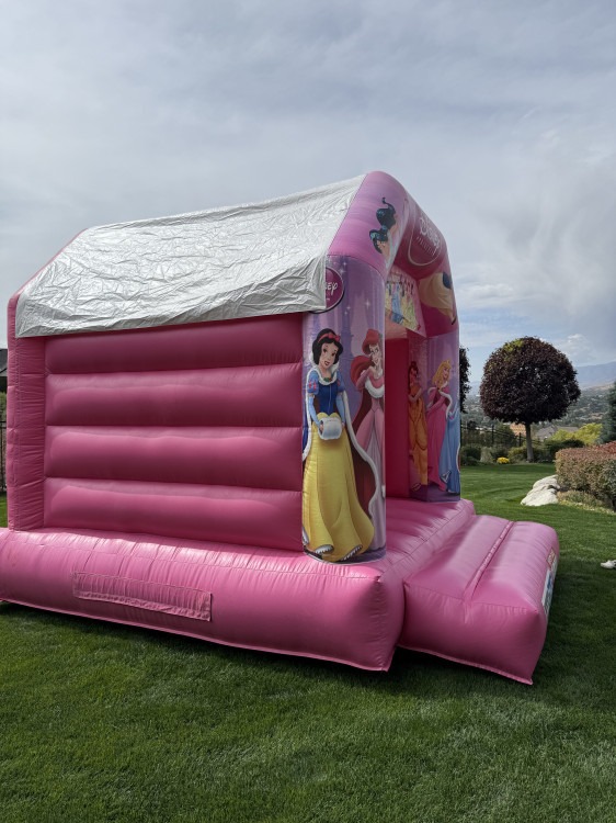 Bring a fairytale to your party with this Princesses Combo — a pink, covered bounce house that combines a roomy jumping area with a small attached slide and splash pad landing to keep little guests entertained for hours. The castle-style roof and printed princess graphics on the front pillars, canopy and interior create an immersive, storybook look that’s perfect for birthdays, princess-themed events, or any celebration where imagination matters. Built with a raised entry step and low-profile walls, it’s easy for kids to climb in and play while the open front lets adults keep an eye on the action. Durable, wipe-clean vinyl makes setup and cleanup simple; follow posted safety rules and supervise play for the best experience. Ideal for young children who love princesses and pretend-play fun.
